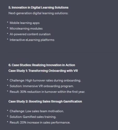 In demonstrating an AI workflow, I challenged ChatGPT to develop a presentation highlighting examples of innovation evidenced by my employer, GP Strategies.