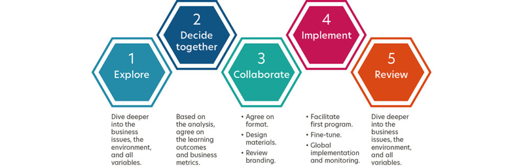 Effective leadership development puts the learner in the center of the learning experience. Learner-centric development means that we begin by getting to know your business, including your leadership challenges and potential leadership development solutions. Then we engage in our curated five-step process to develop a learning journey designed to produce the desired growth and behavioral outcomes.