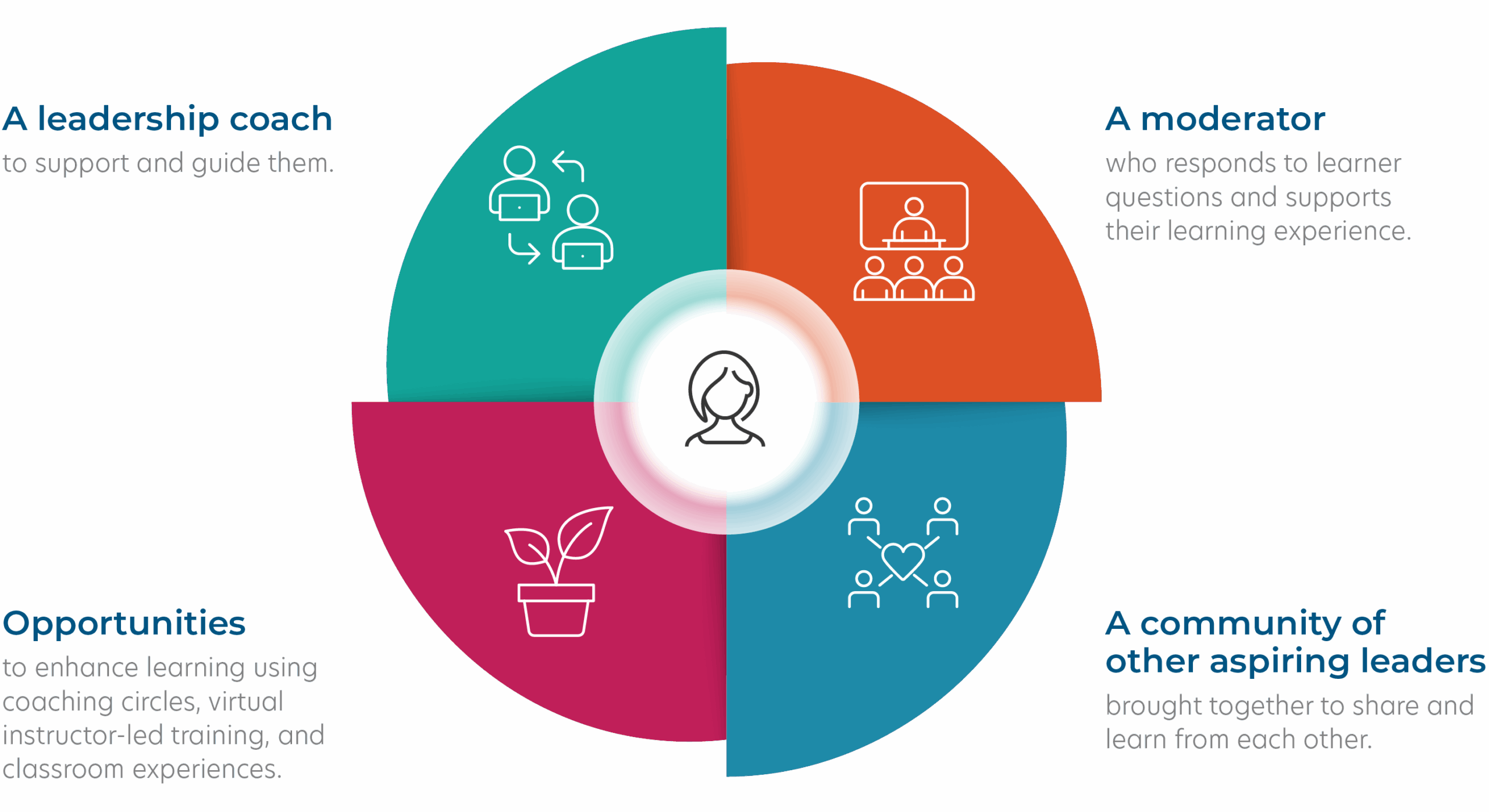 The Leadership Essentials experience seamlessly blends digital learning with human connection and provides learners with: