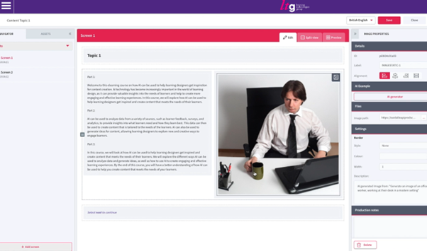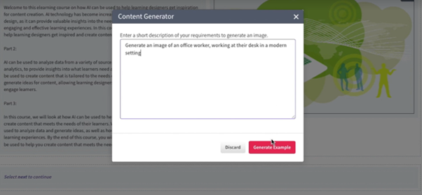 Prompting for images can be done within an AI chatbot like ChatGPT, an AI image generation tool like Midjourney, Stable Diffusion, or DALL-E, or even within a learning authoring tool. Different learning content authoring tool providers, such as Gomo Learning, are currently prototyping and working on ways to integrate AI into their tools without the need to log on to an additional tool.