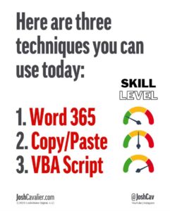 With Josh’s acknowledgement and permission, I put each of his recommended methods through their paces and found that his first workflow recommendation (using Word 365) was by far the most accessible for those not wearing pocket protectors.