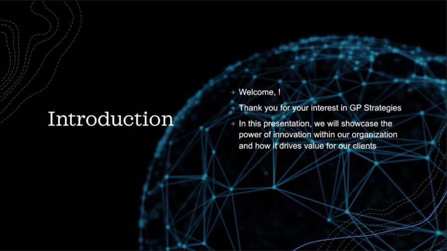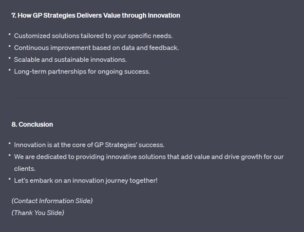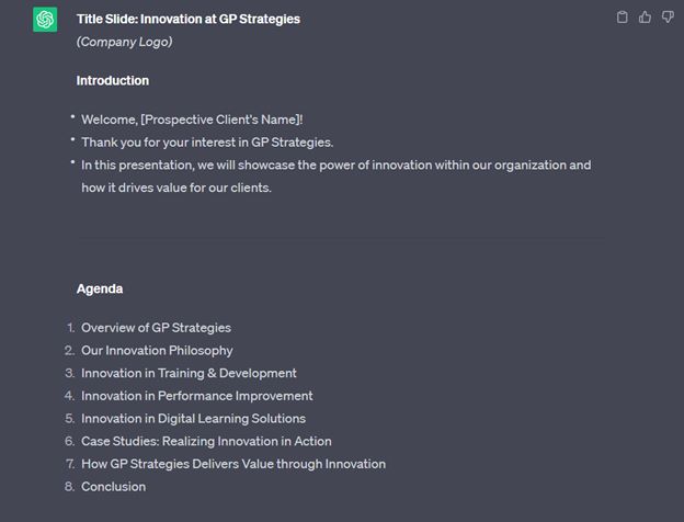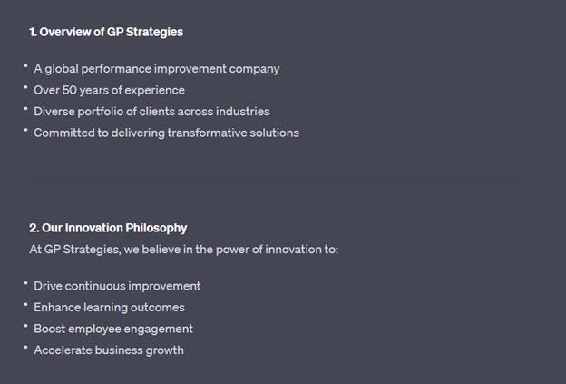 I wanted to see just how well ChatGPT could sleuth public-facing information related to our organization and formulate a presentation—something more in line with a company briefing presentation we might share with a prospective client. After all, that’s a big part of my role. So, I chose a topic that I know a lot about: innovation at GP Strategies.