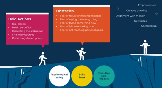 In fact, Leah Clark’s research revealed the critical need for psychological safety, trust, and executive role models in order for leaders to take bold action and overcome obstacles.