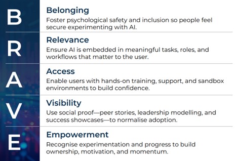 Resistance to AI adoption is real, whether it’s skepticism, fear, or lack of clarity. Ella Richardson’s presentation “Embedding AI in the Enterprise, Driving Adoption Through Behavioural Change” explored the BRAVE framework (Belonging, Relevance, Access, Visibility, Empowerment). This framework offers a roadmap for fostering inclusion and experimentation.