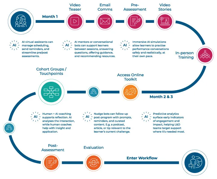 As AI tools become more sophisticated and accessible, we have an opportunity to rethink not just what blended learning includes but also how it unfolds over time. The traditional journey includes several critical touchpoints, but these steps are also potential failure points: things like scheduling, collecting feedback, or sustaining behavioral change often break down due to time or resource constraints.