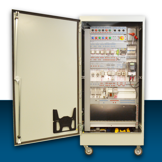 We designed this station to introduce maintenance personnel to the fundamentals of relay-based motor control, PLC-based motor control, and troubleshooting. The hardware in this cabinet includes industry standard equipment that maintenance workers operate and repair daily.