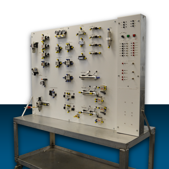 This station is a portable pneumatics training system on which learners can design, build, and troubleshoot basic and advanced pneumatic circuits in a safe environment. Various pneumatic components are integrated, including: