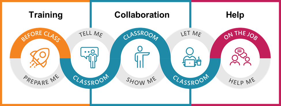 A solution that drives sustainable change must also include multiple knowledge transfer techniques to prepare users to be productive and readily support themselves on the job. The five techniques within the Adult Learning Model are: