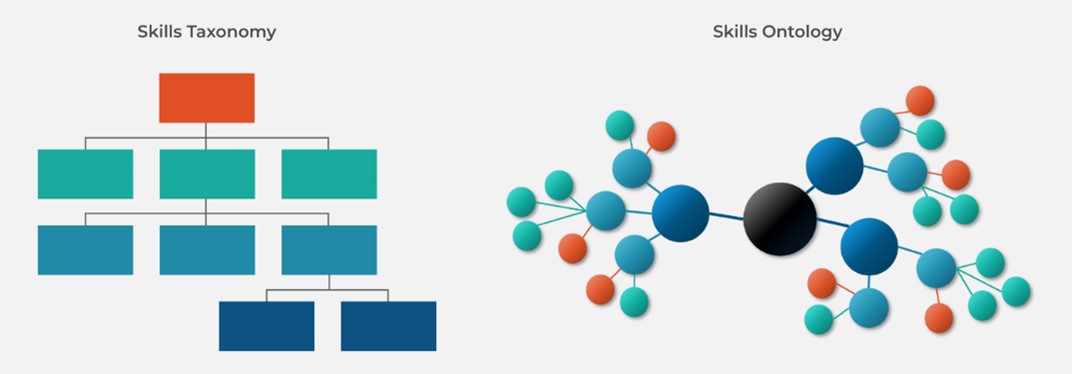 So what are ontologies and taxonomies, and what do they have to do with skilling strategies? Enterprise skilling strategies are built using either a taxonomical or ontological method. Taxonomies offer a hierarchical classification of skills, while ontologies provide a more flexible and nuanced view of the relationships between skills, tasks, and job roles.