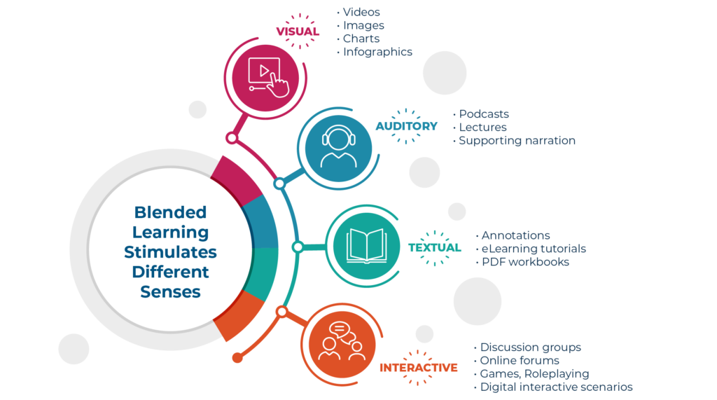Blended learning has tremendous value because the brain processes different kinds of information in different ways. Learning journeys are constructed using a combination of activities that target these different areas. For example: