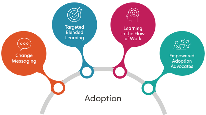 Successful technology adoption depends on empowered, capable employees. Our end-user enablement solutions focus on four key elements to drive adoption and maximize business impact: