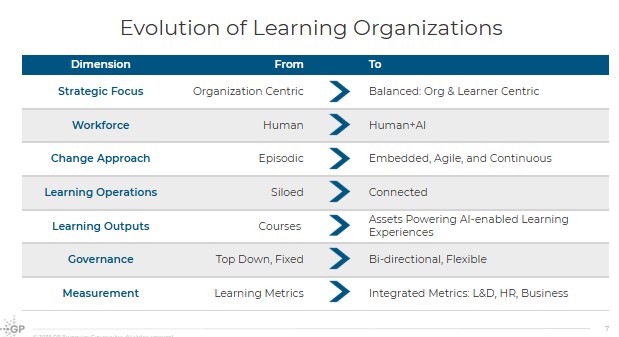 - Enabling Data as a Force Multiplier: Learning organizations should use data to not only track and show course completion but to drive insights that shape future strategy to more deeply align with business goals.